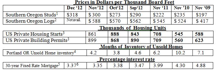 1) Random Lengths. Through Sept. 2012, 2”x4”x8’ precision end trimmed hem-fir stud grade from Southern Oregon mills. Starting Oct. 2012 the stud grade was consolidated with and is now reported as Kiln Dried Studs, Coast Hem-Fir 2x4x8’ PET #2/#2&Btr. Price reported is Dollars per Thousand Board Feet, generally the third week of the month. One “board foot” of product measures 12 inches by 12 inches by one inch thick.
